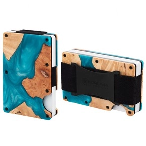 Aluminiowe etui z gumką na karty zbliżeniowe RFID (drewno + turkusowa żywica)