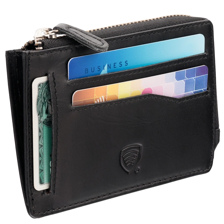 Mały skórzany portfel na karty zamykany na zamek (Czarny)