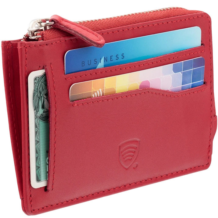 Mały skórzany portfelik damski na karty zamykany na zamek (Czerwony)