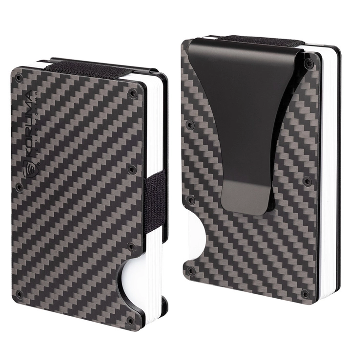 Aluminiowe etui antykradzieżowe na karty z klipsem do banknotów lub jako element do przypięcia do paska. Klips jest elementem, który można usunąć poprzez odkręcenie śrubek za pomocą śrubokręta znajdującego się w zestawie. Karty umieszczone pomiędzy płytkami są trzymane przez wytrzymałe gumki. Etui zostało pokryte z zewnątrz karbonem w kolorze czarnym.