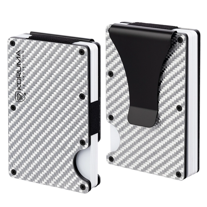 Aluminiowe etui antykradzieżowe na karty z klipsem do banknotów lub jako element do przypięcia do paska. Klips jest elementem, który można usunąć poprzez odkręcenie śrubek za pomocą śrubokręta znajdującego się w zestawie. Karty umieszczone pomiędzy płytkami są trzymane przez wytrzymałe gumki. Etui zostało pokryte z zewnątrz karbonem w kolorze srebrnym.
