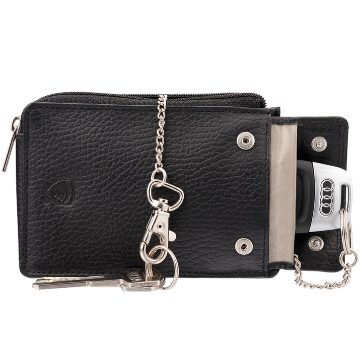 Trzymając kluczyk samochodowy w kieszeni z klapką minimalizujesz ryzyko przechwycenia sygnału emitowanego przez kluczyk. Jest to możliwe dzięki zastosowaniu specjalnego materiału tłumiącego sygnały radiowe. W środkowej kieszeni etui możesz trzymać dodatkowe kluczyki np. do mieszkania oraz dowód rejestracyjny (nareszcie wszystko w jednym miejscu). Natomiast w zewnętrznej kieszeni zamykanej na zamek możesz bezpiecznie trzymać zbliżeniowe karty płatnicze.