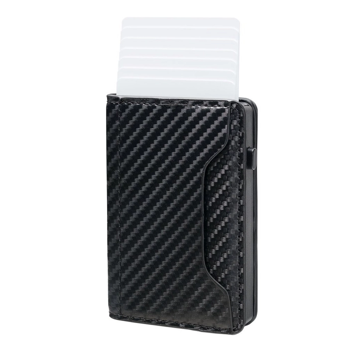 Aluminiowy portfel z wysuwaniem i zabezpieczeniem kart zbliżeniowych (czarny, carbon)