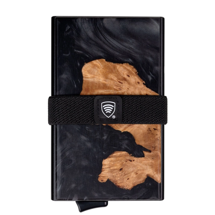 Aluminiowy portfel z wysuwanymi kartami i ochroną kart zbliżeniowych (drewno + czarna żywica)