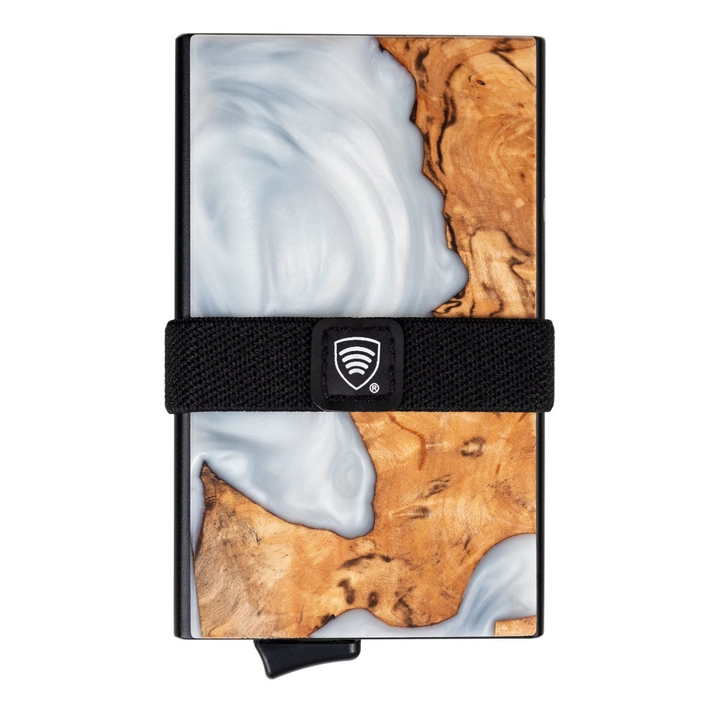 Aluminiowy portfel z wysuwanymi kartami i ochroną kart zbliżeniowych (drewno + biała żywica)