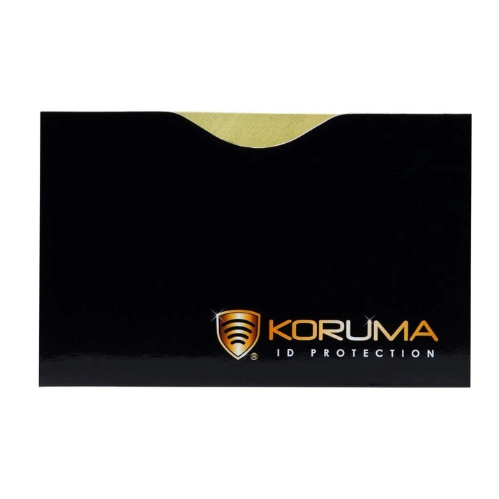 Poziome etui chroniące karty zbliżeniowe przed nieautoryzowanym dostępem z logo marki Koruma® w kolorze złotym. Wymiary etui dobrane są tak, aby swobodnie można było włożyć je wraz z kartą do przegrody zwykłego portfela. Etui przeznaczone na jedną kartę wielkości karty bankomatowej (wielkość opisana przez standard ISO/IEC 7810:2003).