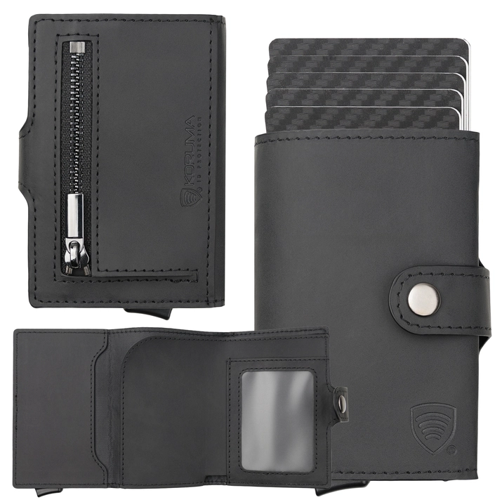 - Połączenie aluminiowego etui z portfelem wykonanym z materiału PVC.